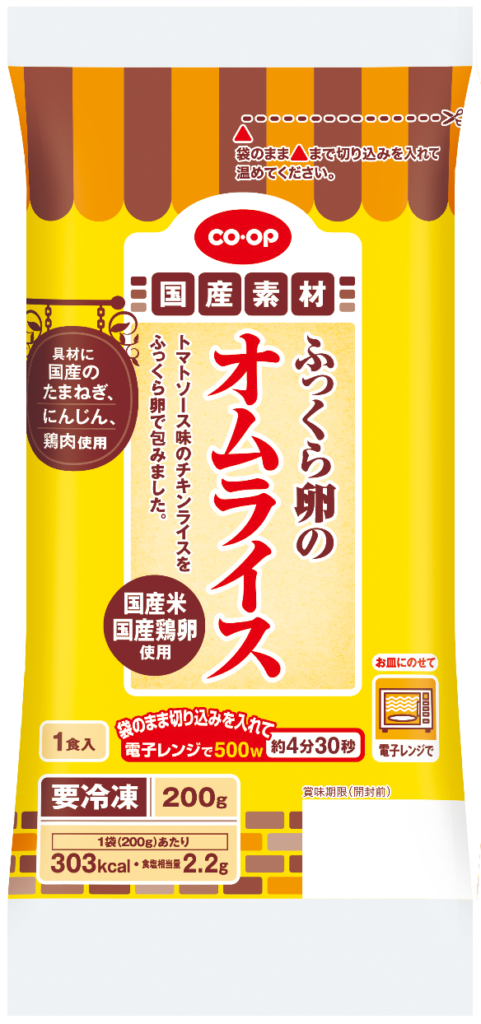 ふっくら焼き上げた卵シートでチキンライスを包みました。チキンライスは国産のたまねぎ、鶏肉、にんじんの具材入りです。