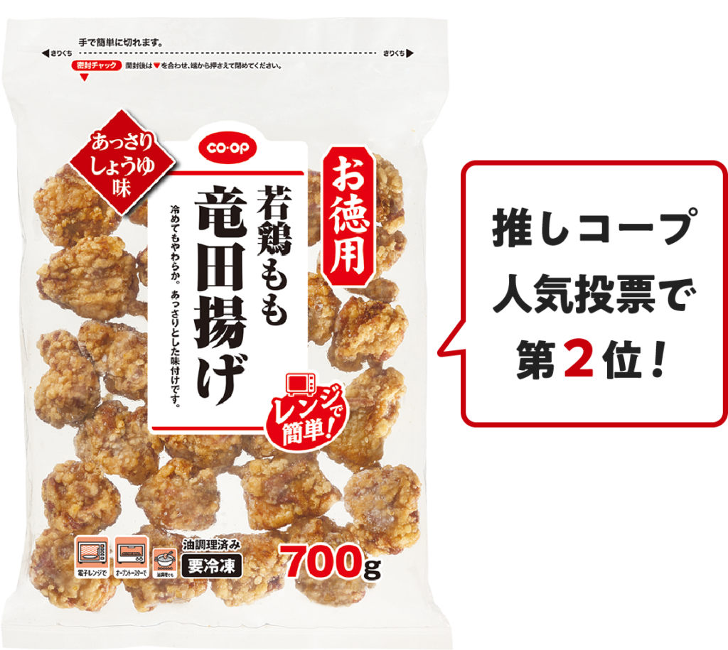 若鶏もも肉を使用した、あっさりしたしょうゆ味の竜田揚げです。電子レンジで調理できます。