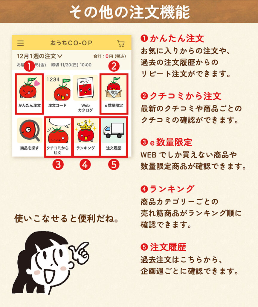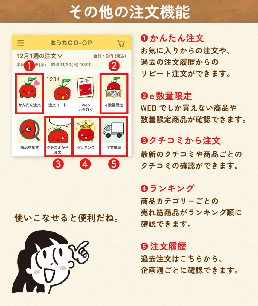 アプリの「おうちCO・OP」から確認してみてください。それぞれの便利な使い方は今後、詳しく紹介します。