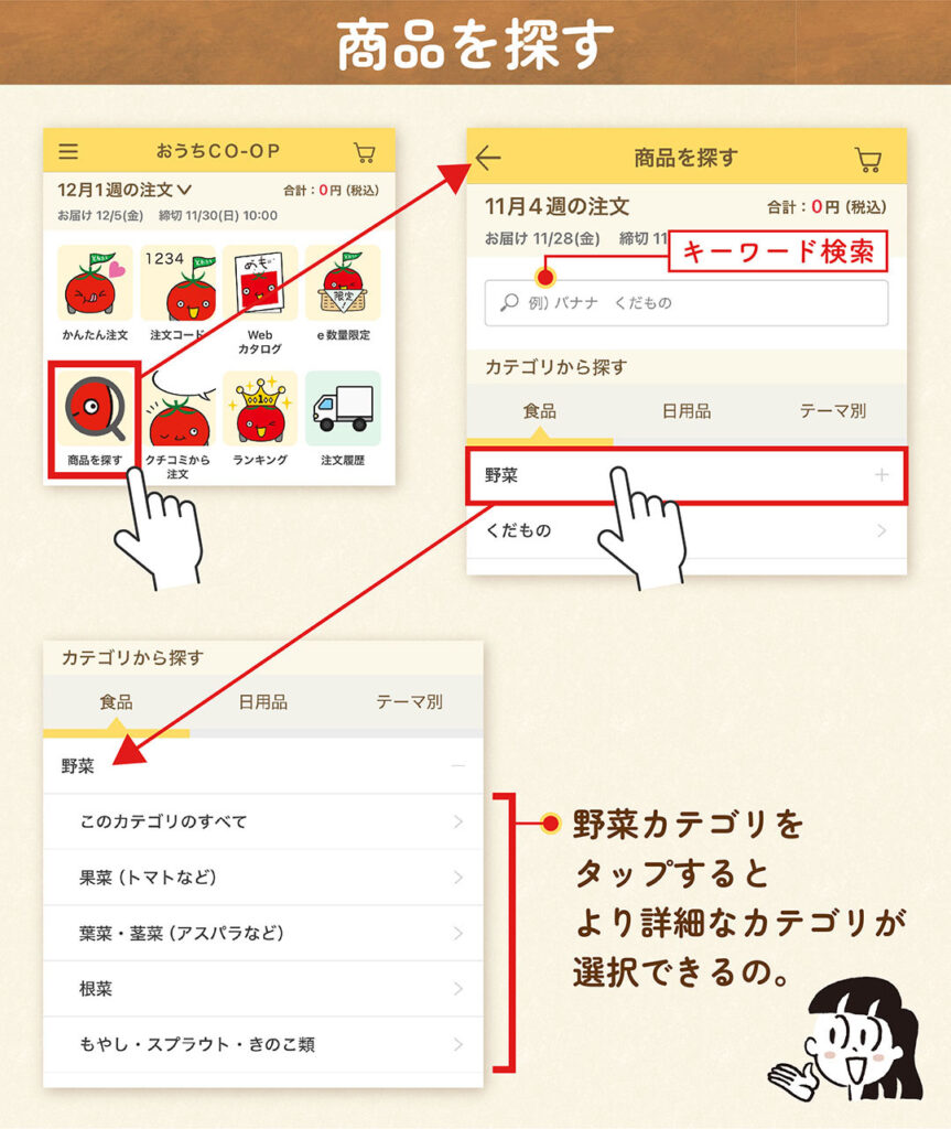 トマトが欲しいなど決まったものを探したい時には、キーワードでの検索を、野菜の中から何か探したいときには、食品の中の野菜カテゴリから検索ができます。