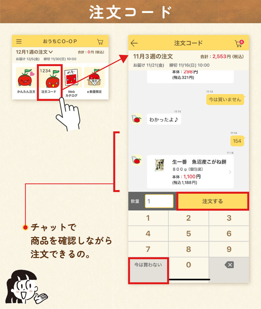 注文コードを選ぶと、チャット画面が登場します。注文コードを入力すると商品情報が出てくるので、数量を入れ、「注文する」をタップすると注文が完了します。