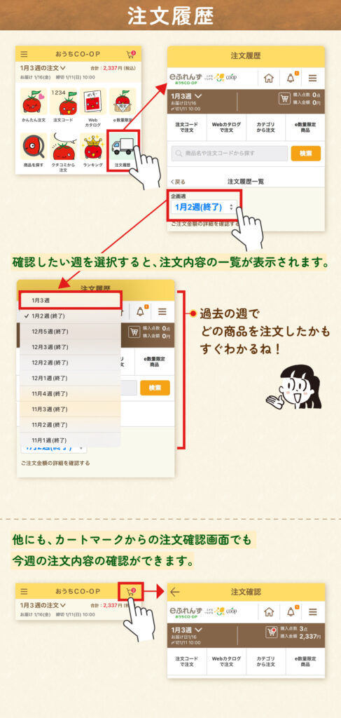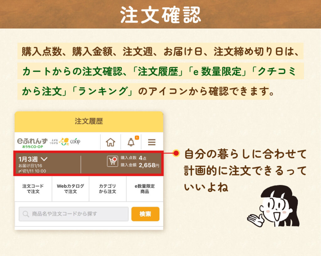 今週の購入金額や注文の締め切り日時もすぐに確認できます。