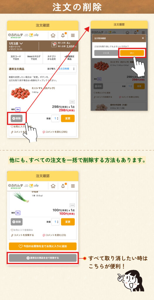 注文の削除は、注文履歴もしくは右上のカートから、