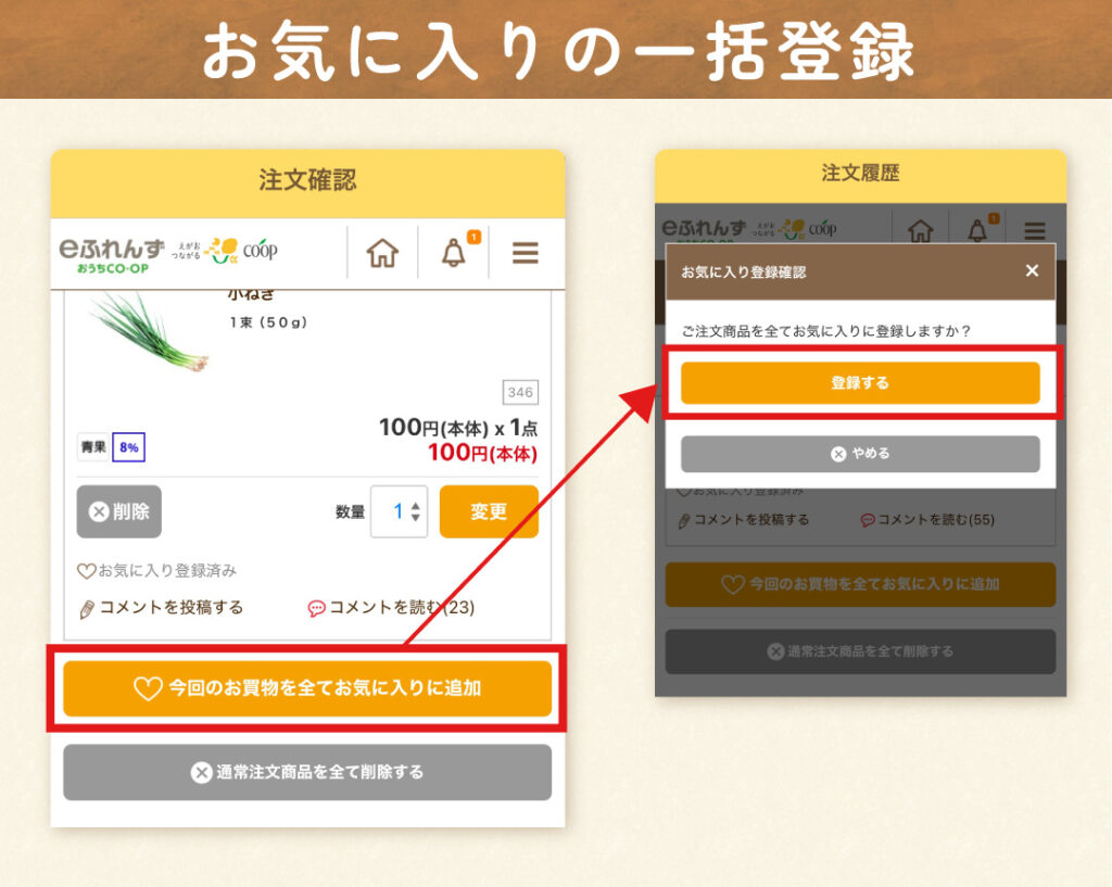 注文履歴から注文した商品を一括でお気に入りに登録することもできます。