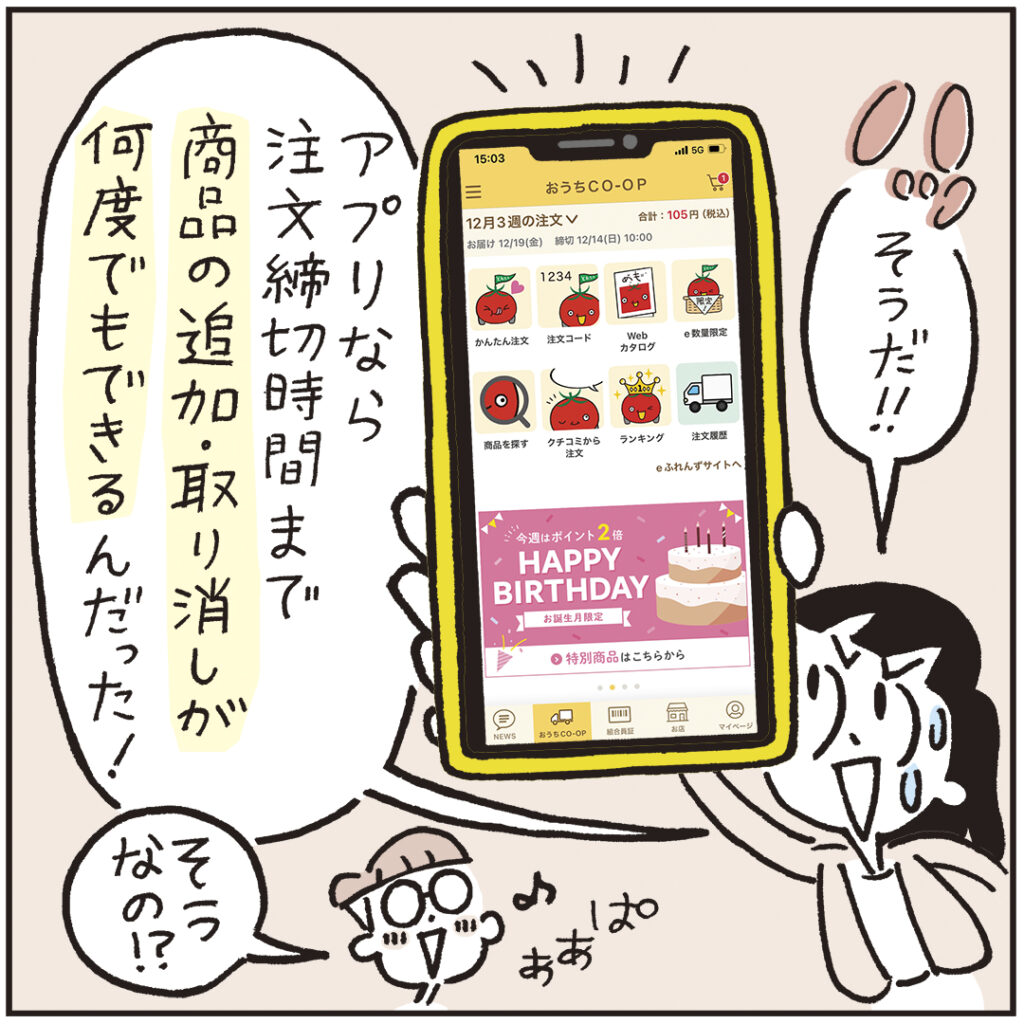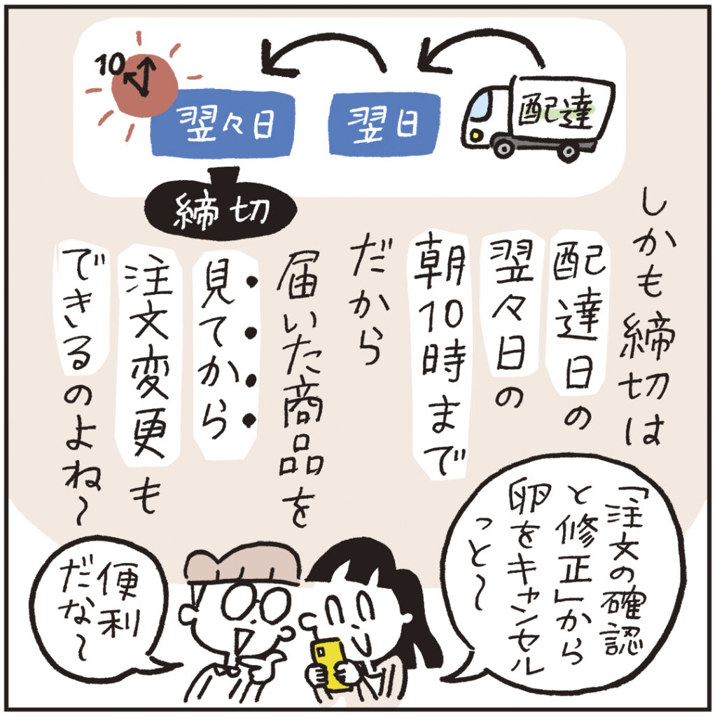 アプリでの注文の締め切りはお届け5日前の朝10時まで可能です。配達後に商品を見てから注文の変更も可能です。注文用紙での注文よりも締め切りが長いことも、便利なポイントです。