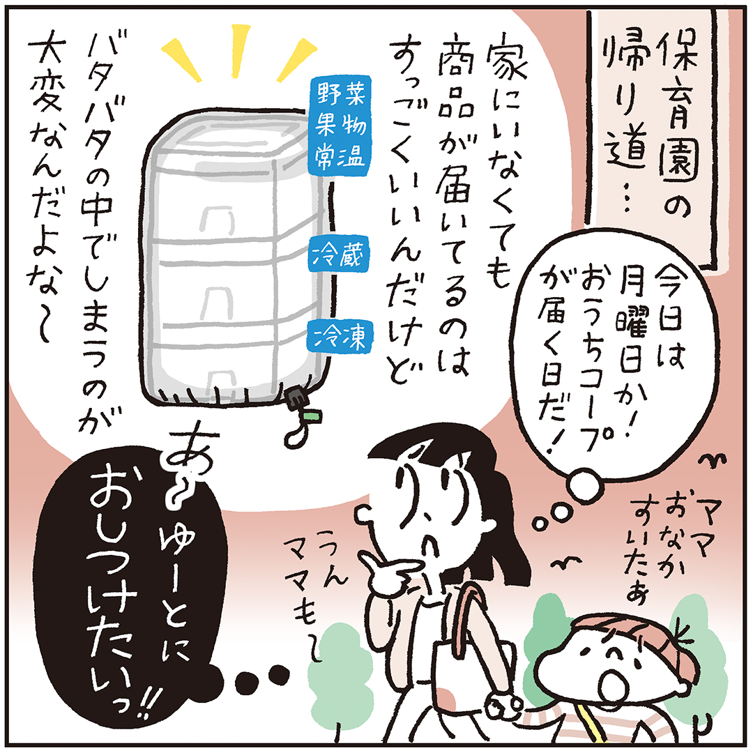 「コープがあるとここがいい!」という日常のワンシーンを、ワーママゆっこの暮らしから4コマ漫画でお届けします。